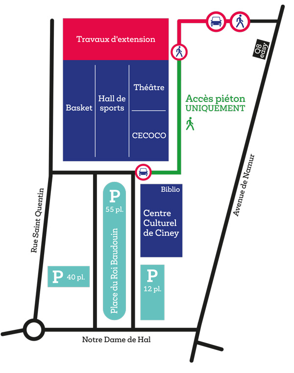 Durant cette période, la ruelle située entre le bâtiment administratif et les anciens ateliers communaux sera totalement fermée à la circulation. Le théâtre reste évidemment accessible à pied mais uniquement par la place du Roi Baudouin.